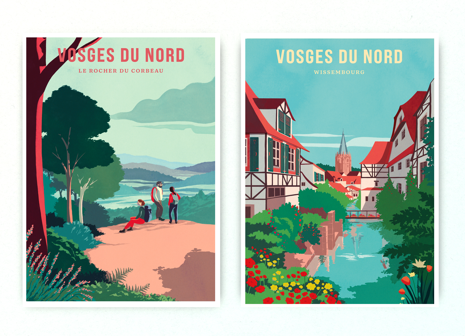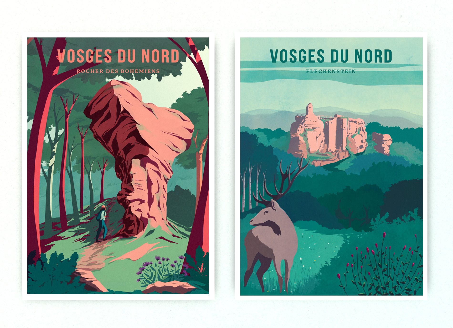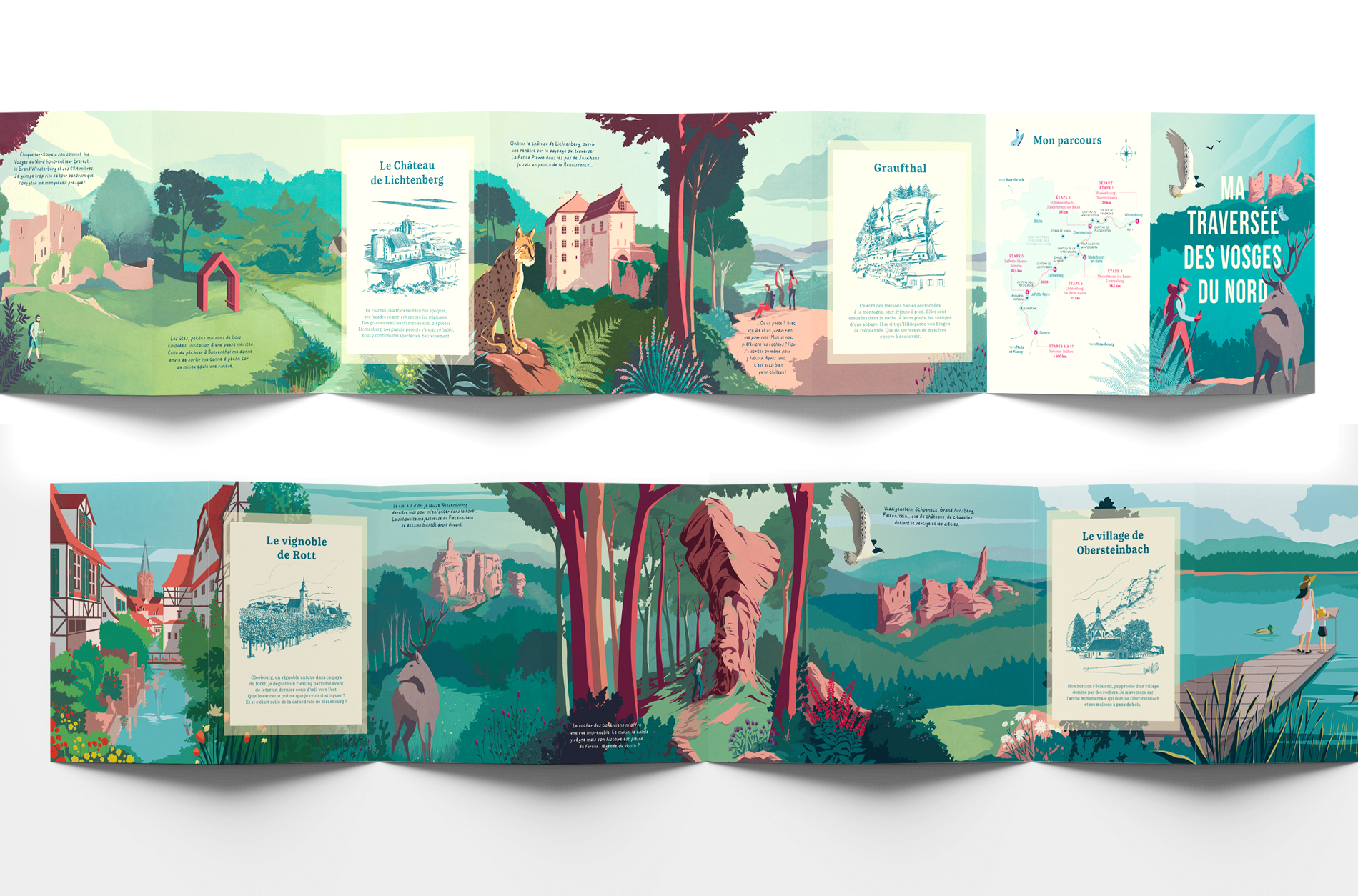 Le Parc naturel régional des Vosges du Nord a souhaité valoriser les richesses des paysages des Vosges du Nord à travers des illustrations originales et d’un support graphique, moderne et illustré. Conception graphique et réalisation d’un carnet de voyage sous forme de dépliant haut de gamme, accompagné de 10 posters illustrés des paysages emblématiques des Vosges du Nord. (format A3 et A2)